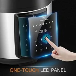 - Digital LED Touch – Screen With 22 Cooking Presets – A touch on the panel, selecting one of 15 cooking presets to easily cook – Steak, Chicken, Seafood, Shrimp, Bacon, Frozen Foods, French fries, Vegetables, Root Vegetables, Bread, Desserts, Preheat, and more. The touch-screen control panel make this pressure cooker and air fryer combo easy to use! The built-in preheat function can ensures the cooker reaches desired temperature.
