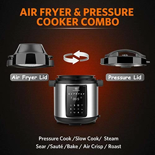 - All-in-One Pressure Cooker & Air Fryer Combos – This 6-quart pressure cooker and air fryer combo has the multipurpose cooking capabilities including steam, pressure cook, slow cook, air crisp, dehydrate, bake/roast, broil for preparing mouthwatering dishes with more flavors. A multifunctional cooker that saves your space and provide convenience.