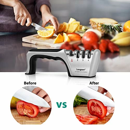 - ?Multi-function: With the 4-stage knife sharpener, you can sharpen blunt knives easily and professionally. Three step sharpening process (coarse, medium, fine). Keeps your kitchen knives brilliantly sharp. (Note: Not suitable for serrated knives)