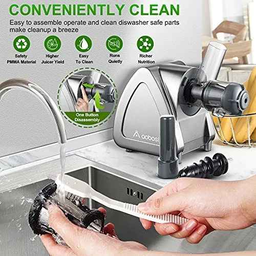 - β?γQuick & Easy to Cleanγ: This juicer machine features a safety lock design, helps you easy to assemble and disassemble in minutes. Has REVERSE FUNCTION to avoid stuck and helps you to clean. All detachable parts are made of high quality Food Grade anti-oxidation materials, easy cleaning with a bonus brush or can be safely cleaned in your dishwasher.