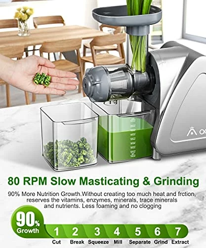 - β?γHigh Juice Yield & Richer Nutritionγ:slow masticating can perfectly separate juice and pulp,extracting higher-purity juice and preserving higher nutritional value. Our auger spins at 80 RPM , extracts up to 20% more juice and 30% more vitamins and minerals. 80 rpm lower speed means no heat build-up and less oxidation. Juice cup baffle included can also help to separate juice and pulp further.So we can drink the original flavor and absorb the most of the nutrition better with this juicer.