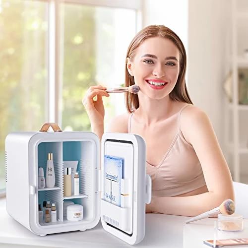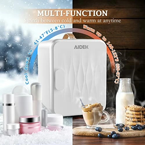 - COOLING & WARMING – The cute refrigerator cools down to 41-47ยฐF(5-8ยฐC) and warms up to 140-152ยฐF (60-67ยฐC). Perfect storage for cosmetics, fruit snacks, hot and cold drinks, and infant breast milk.