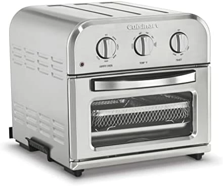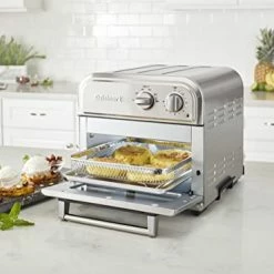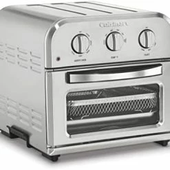 See photos of foods I have cooked in this air fryer. I bought it primarily for use as a small countertopoven more than as an alternative to pan-frying, and this model (called simply βcompact air fryerβ not βair fryer/convection/toaster ovenβ was less expensive than most other oven-like options, despite the fact that it has convection-oven fans that circulate hot air around the whole space. Unlike the more expensive versions by Cuisinart and others, this model (about $94 when I got it, down to $85 now) only has heat elements at the top (and has only two controls, the temperature dial and the on-off/timer dial. It is only possible to turn on for a timed duration, maximum 60 minutes (I havenβt used it for anything longer than 30 minutes so far, and since I can be distractible, I prefer to limit how much I can burn things with the auto-off timer feature. Itβs probably a good choice for anyone with distractibility or memory problems to prevent fires. However, the top-only heat elements mean that, while the bottom of things gets *cooked*, it doesnβt really get *browned* unless you flip it halfway through. Thatβs why they donβt call this model a toaster even though you can toast in it, just one side at a time.So, what have I made with it? A surprising variety of things. From left to right, fries, roasted red bell pepper and onions, and an Aidells chicken burger; a loaf of artisan bread; crisped tortillas for tostadas; panko pork and vegetables; and oatmeal-raisin cookies. You can see on the cookies that, unlike in the oven, you need not worry about the bottom of the cookies burning and sticking to the pan; they are cooked all the way through but the underside isnβt brown, only the top. If I wanted the bottom brown too I could have flipped them for a minute or two. I did flip everything else pictured (except the bell pepper and onions) for even browning.The bread was the biggest surprise and delight, as I love to make small loaves frequently so I always have fresh bread, and during summer I hate to turn on the big oven for half an hour or more, just for a small loaf. I actually made two loaves that day as an experiment. The first one got a bit too brown and crisp on the top and was off-white (though fully cooked) on the bottom, in for 20 minutes at 400Β° – it also was flatter because it only had a 30 minute final rise before baking, but this one pictured rose for an hour, and was baked on parchment paper in the elevated basket instead of on the flat metal sheet. But the important thing was that I put it in at 375Β° for 12 minutes, at which point the outside was fully set; then I flipped it over and gave it ten more minutes, thus browning the underside too. It wasnβt too crispy-crusted to slice well, but it had a very satisfying snap when biting into the crust. I can imagine making perfect banh mi rolls in this oven. This was a fairly wet dough, not quite as wet as the NYT no-knead recipe but close.Other than a few cooking classes, I had never used a convection oven before. It really cuts down on cooking time and temperature settings. If you have used them, you wonβt have as much adjusting to do with this.One thing I saw mentioned in another review was a loud noise and the buckling of a baking tray. This happened to me but after the tray cooled down it snapped back into the former flatness, and it didnβt affect what I was cooking at all. Iβve had flat pans do this under high heat, especially from one direction only, in a regular oven, so it didnβt alarm me, that is how metals can react to sudden and rapid heating, certain metals more than others (thin aluminum does it more than steel). If it really bothers you, Iβm sure you could find a thicker steel pan to use in this oven, but since thereβs no lasting damage, I donβt fuss about it.By the way, air-fried French fries are really unappetizing. Crispy outside, sure, but too dry and flavorless inside. Cuisinart recommends spraying oil on starchy things to keep them from sticking to the basket or pan, but you also really need some fat for flavor and to keep the food from drying out. So donβt think this is going to be the answer to your low-fat diet. (I also canβt stand air-popped popcorn; in fact, I have recently rediscovered popping corn in oil in a saucepan on the stove, the way we did before microwaves and popping machines, and itβs actually delicious if you use good olive oil β even without adding butter! I was shocked.)If I were buying it again, I might wait till I could afford the more expensive ones with 4 dials and top and bottom heat elements so I could avoid the split-time food-flipping, but I didnβt have more than $100 to spend and now that Iβve figured out how to brown the whole item, Iβm happy not to have had to shell out $200-$300. I might also like a better-insulated one, because this does warm up the immediate area and can be hot to the touch; but itβs usually not on for long, and the heat dissipates quickly once itβs turned off.