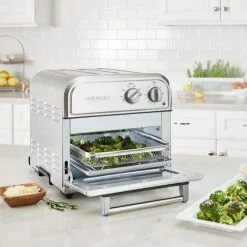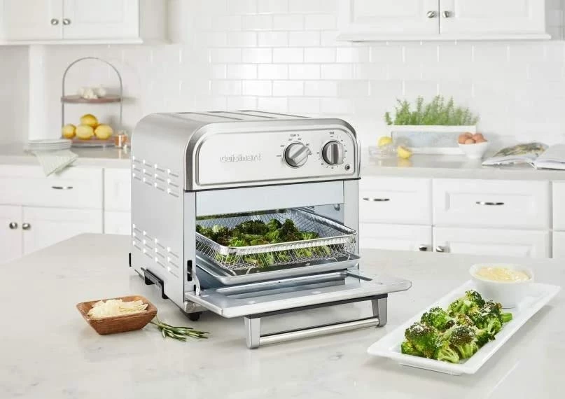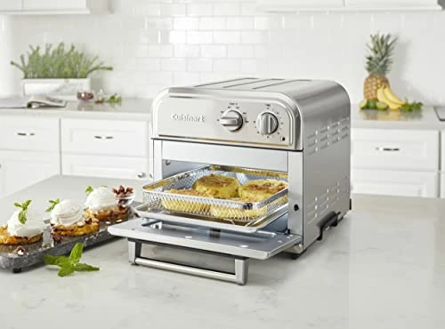 I bought this in anticipation of a future kitchen remodel, planning to use it in a temporary kitchen (which I’ll set up in a bathroom.) So even though I liked the larger Cuisinart model at first look, I decided this smaller unit will fit in my space much better. And I’m glad I got the smaller one – it’s more than sufficient if cooking for just a few people (and it’s a lot less expensive!)So I’ve been putting through its paces for the last week. And I have to say – wow! This lil guy is really useful even in a full-service kitchen with a regular big oven, especially if you’re cooking for one or just a few people . So far I’ve made crispy breaded chicken tenders, baked potatoes, air-fried sweet potatoes, roasted Cornish hen, baked apples, air-fried beet chips, pizza, roasted chickpeas, and toast. (Contrary to some reviews here, it can toast bread just fine – the instructions are in the manual, in some notes right before the recipes.)Everything turned out very well (except one time I did not pay attention and set the temperature wrong and burned my toast.) The chicken was very tender and juicy, and the baked potatoes and roasted hens achieved that nice crispy skin. Roasted chickpeas were crunchy, so were the beet chips and the breaded chicken.Air-fried food doesn’t taste the same as food fried in oil – air-frying is essentially baking with hot air. So this method will deliver a good crunch, but add dipping sauces or even just ketchup if you miss the taste of the oil.Now the dials are not very precise – there is no “click” between different settings so you have to eyeball it. I did not have any problems with the timer, as some have noted here. The instructions say to twist the dial past your desired time, then backwards to what you want. I’ve been doing that and the timer seems to be working fine.I used some of the recipes in the included manual and some that I found online, following suggested temperatures and cook times and so far everything has come out great. If you need to open the door early to check your food or flip it, the fan will stop, but the timer will keep on ticking if it has not reached the end yet. So you may have to add a little time to make up. I do wish it had a light so that you didn’t have to open the door to check the food – I guess the bigger model has one.When using the oven, don’t forget to slide the unit forward to the front edge of your counter; otherwise when you open the door, the handle will rest on the countertop and prevent you from opening the door all the way, which makes it difficult to slide the tray out. But you’re supposed to move it away from the wall anyway when using it – it vents heat back there, and the top gets hot as well. So just slide it forward when using, away from the wall and any overhanging cabinets.This smaller oven will not accommodate a whole chicken. However chicken pieces, or 2 Cornish hens fit just fine.The basket and drip tray seem kind of flimsy, but were not too difficult to clean. I have been using parchment paper to line the drip pan each time I use it, which helps a lot. And a nylon brush is useful for cleaning the basket. The interior of the oven wipes clean very easily with a paper towel or sponge.This thing exceeded my expectations…I call it my Easy Bake Oven and already prefer it to the big oven for many tasks. Five stars!