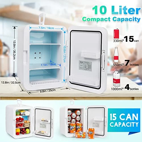 - βPortability with Spacious 10L Capacity: Thanks to its compact size and roomy interior, our mini fridge is incredibly versatile. Use it to store food, drinks, beer, snacks, breast milk, skincare products, and more! No matter whatβs inside, keep it in your bedroom, kitchen, dorm, car, or wherever else adventure takes you.