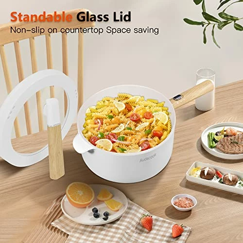 - VERTICAL TEMPERED GLASS LID-The tempered glass lid of the Audecook electric hot pot is heat-resistant and explosion-proof. You can check and control the status of your non stick frying pan at any time, and retain the heat and flavor of your food during the cooking process, so your food comes out perfectly every time. At the same time, the vertical design can stand the glass cover on the desktop, saving more space for your desktop!
