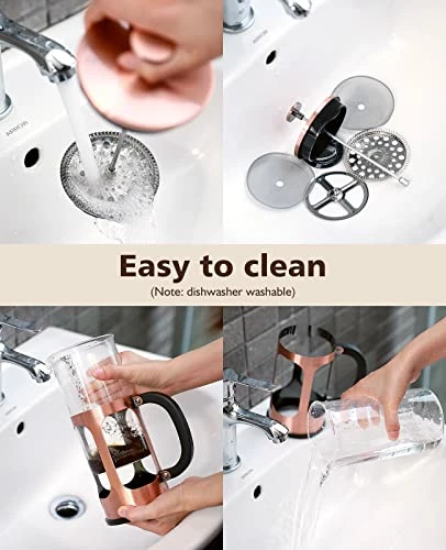 - 【User-Friendly Coffee Maker】Our BAYKA French Press is incredibly easy to use that it takes only four steps to make a cup of coffee. It is suitable for both, beginners and experienced coffee drinkers. Every part of the press can be disassembled for cleansing purposes so that the small coffee grounds can be cleaned out from the filter layers and even the tiniest spots.