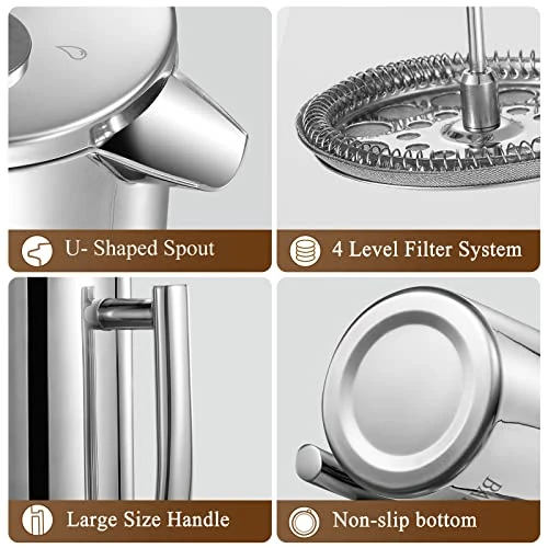 - Thicker Stainless Steel, Refuses to Break – We aim to serve you a quality French Press that will accompany you all of your life. Glass presses are fragile and become vulnerable in front of stainless steel. Choose our French Press which only uses high quality 304 stainless steel for better corrosion & rust resistance. You don’t need to worry about the French Press being damaged anymore.