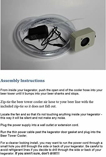 - Works with commercial or homebrew beer kegs. Easy to install – just insert into your beer tower from inside your kegerator, zip-tie the hose to your beer line with the included zip-tie so it does not slip out, plug-in and you are ready to go.
