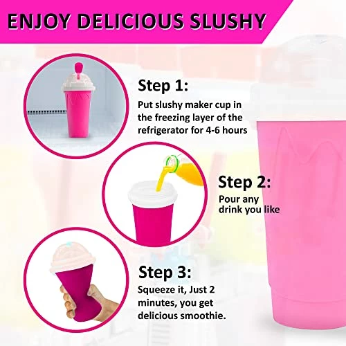 - ? EASY TO USE: Freeze the slushie cup in freezer about 3-6 hours before making slushy. Take it out and simply pour in your favorite drink & squeezes gently with lid covered, your slushy will be ready instantly. Enjoy the slushy party by adding different flavors according to taste!!