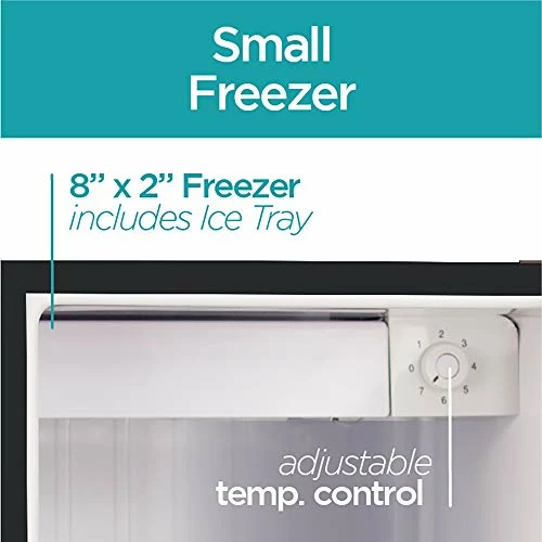 - CONVENIENT FEATURES – A reversible door, leveling legs, and adjustable temperature control (33.8 degrees Fahrenheit at the lowest setting) make this mini fridge even more practical. The small freezer (8 inches wide x 2 inches tall) fits ice packs, most frozen dinners, and the included ice tray
