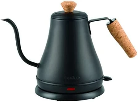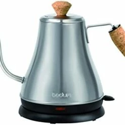 Cool kettle for 1/3rd cost of similar ones. Other reviewers noted a piece of plastic/silicone on the inside but it seems Bodum may have heard you and replaced it with metal. One drawback that gives this 4 stars (keep in mind I only paid $30 sale price): I give the top cork on the lid a few weeks before it rips off. It’s also crooked. It just seems really weak and you have to tug on it to get the lid off. Tiny screw. If Bodum solidified that top cork on the lid, this would be five stars.