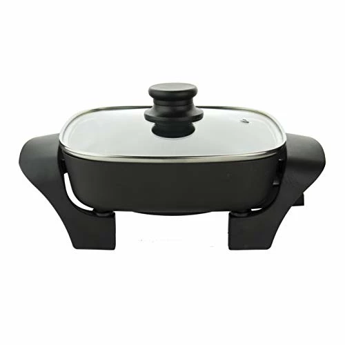I chose this electric skillet because I was looking for an appliance to use on my 1000 watt solar battery. This skillet uses only 600 watts, so that makes it perfect for my battery. To get an idea of size of skillet, I took 1-1/4 lbs. of hamburger, divided it in quarters, flattened into burgers, and was able to fit all four in the skillet with a small space inbetween each patty. This little skillet did a fine job cooking burgers and eggs with the temperature set at only the halfway point. I have no idea how long this non stick coating will last. I let this pan completely cool down on its own before washing it. Metal expands when heated, contracts when cooling down. Don’t know the elastic properties of the coating, so no sudden temp changes, and hoping there will be no peeling of the coating in the future. I know this will sound crazy to US consumers but there are electric skillets out there where the heating element is completely exposed. The element on this little skillet is NOT exposed. So far, I truly like this little skillet. I do wish it had a ceramic coating, but I knew it did not have a ceramic coating when I purchased it, so I did not deduct a star.