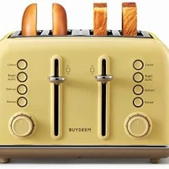 I ordered this toaster after reading the mostly good reviews and because of its retro appearance. I was concerned that the yellow color might be too bright, but it’s very subtle, almost a soft gold, and it was cheaper than the green version. There was a slight dent in one end of the toaster, even though it was well packed, so I’m assuming the dent was there before it was boxed. I decided not to send it back. So far the toaster is working great, toasting evenly in all 4 slots on a variety of bread slices. We have not tried bagels yet. The pull out trays on the bottom for cleaning seem like they’ll be easy to manage. Overall I am pleased by the purchase.