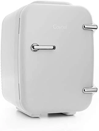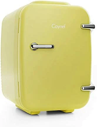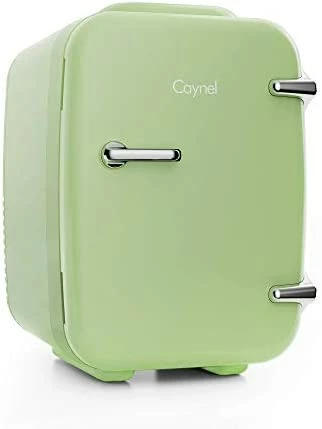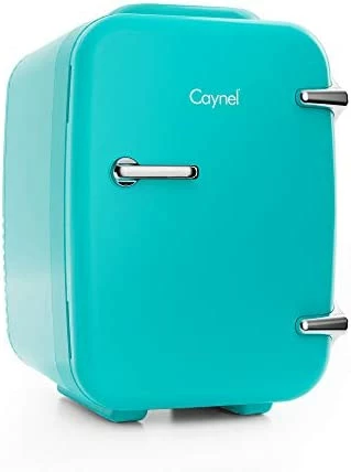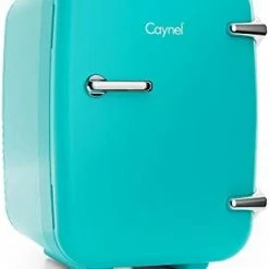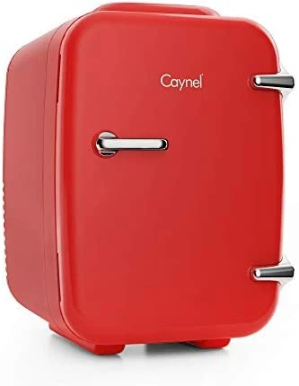 - COMPACT & PORTABLE: Caynel cooler/warmer mini fridge chills 6 12oz. cans and is perfectly portable for personal use. It’s small size, sleek design and convenient carry handle, makes it easy to take the mini fridge with you on the go!