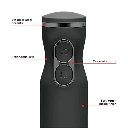 - BETTER HOME BLENDING: The high-speed, quiet 300-watt immersion blender transform food and crushes ice at the push of a button. Enjoy an easy blending process with 2 one-touch speeds: HI & LO. The sleek, ergonomic easy-grip handheld design with soft-touch finish was built to put pureeing power in the palm of your hand, for even results in seconds.