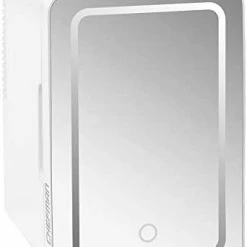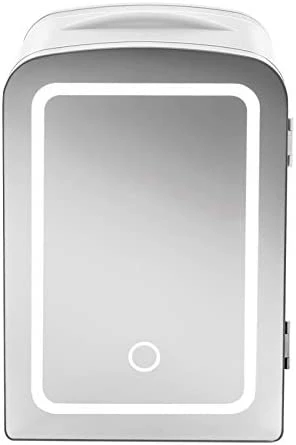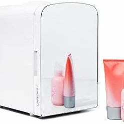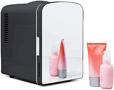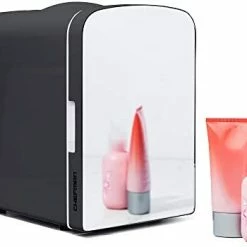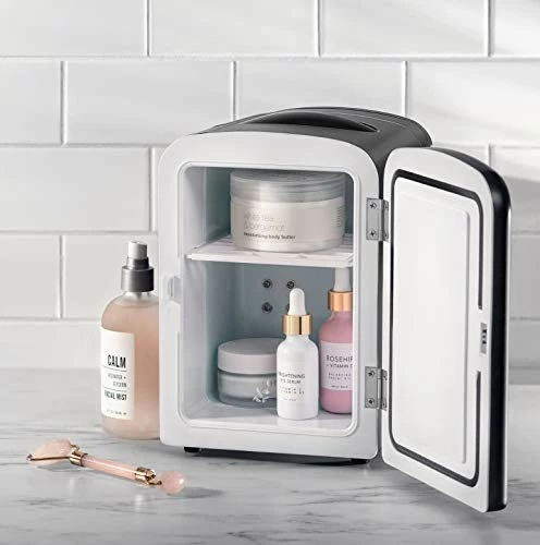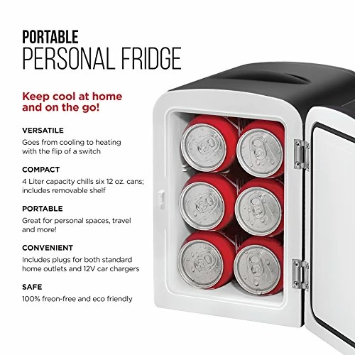 - COMPACT SIZE: The 4-liter capacity fridge chills six 12-oz. soda cans. The interior is 5 x 5 x 7.5 and includes a removable shelf so you can store small items such as yogurt, fruit, milk, juice, smoothies, bottles, cheese, coffee, and skin-care items.