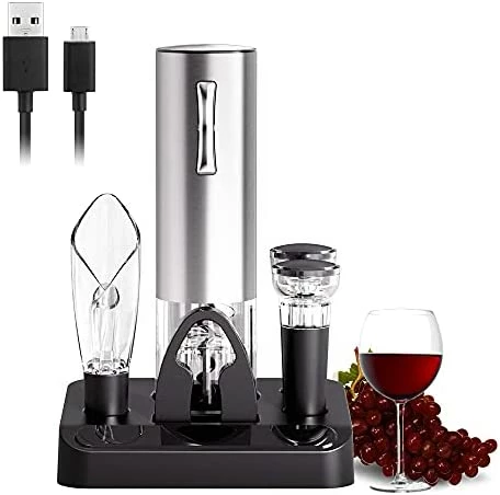 Really glad I purchased this! Beats manually opening wine! Super easy to use, really liked the foil cutter cause it fits around the top and you don’t really have to gauge if you’re on the foil or not. It has a stand for each piece to sit, it is battery powered so I like that because I have a bad habit of forgetting to charge. The cork screw works great, it pulls the cork up with press of button and then will also release the cork for you. Not sure on battery life yet, so far just opened one bottle. It would be a great gift for wine drinkers! Sleek modern design, comes with 2 bottle sealers. Glad I purchased, wish I would of got one a long time ago. Paid more for cheap manual ones over the years than this! Would definitely recommend this!