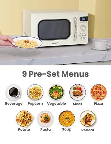 - 【EASY TO USE 】 Cook 9 of the most popular microwave foods in the press of one button. Press the desired pre-programmed button and the microwave automatically starts. Easily make popcorn, beverages, vegetables, meat, pizza, potatos, pasta, soup or reheat other foods. Also includes a large LED digital display, ECO mode, easy-to-read control panel and an interior light.