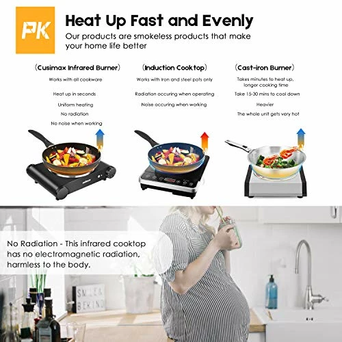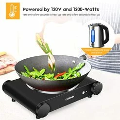 - [HEAT-UP IN SECONDS] Compared to a hot plate burner which takes minutes to heat up, Infrared burners take only a few seconds to heat up. Powered by 120V and 1200-Watts. Conveniently cook a variety of foods such as warm sauces, scrambled eggs, grilled cheese, soup, pasta, vegetables and so much more. Please cover your cookware with a lid when boil water.