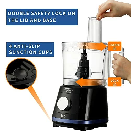 - γEasy to Clean & Dual Lock Protectionγ Dishwasher safe blades, bowl and lid make cleanup easy. Parts are BPA-free in food zones. The food processor has the dual lock protection, it will work only when the bowl locks with the base and the top lid locks with the bowl. If you want to add food during working, add from the large feed chute.