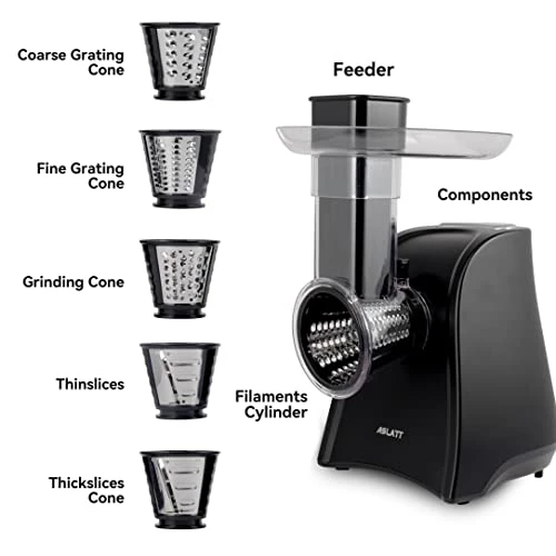 - Multi-functional Blades: there are 5 interchangeable stainless steel blade cones on the cheese grater electric slicer/shredder, that are, coarse grinding cone, fine grinding cone, thick slicing cone, thin slicing cone and grinding cone, which can meet your different needs for cooking.