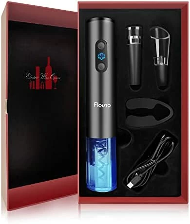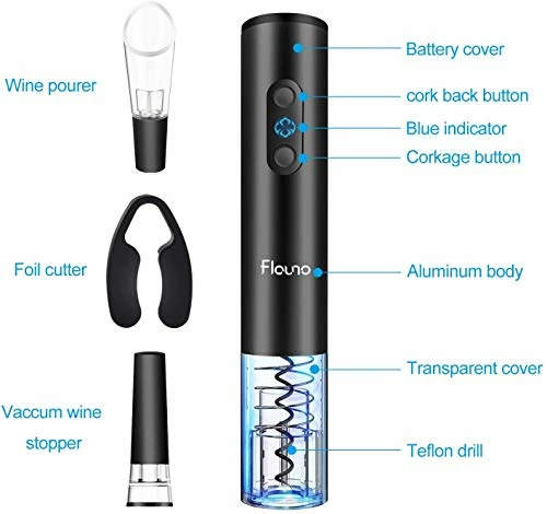 - Reliable product & service – Flauno cordless electric wine corkscrew is made of strong aluminum alloy housing and high-quality ABS plastic. Sturdy Teflon spiral hook for durability. Wine aerator pourer and vacuum stopper are made of food-grade material. If you have any problems, we will provide friendly tech support.