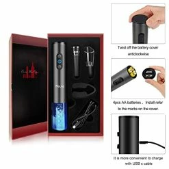 - Powerful wine opener rechargeable – The electric wine opener set is equipped with 4 AA rechargeable batteries (included), and can open up to 120 bottles on a single charge. And the internal advanced powerful motor can operate with low noise and low power consumption, allowing you to unplug any type of corks with ease.