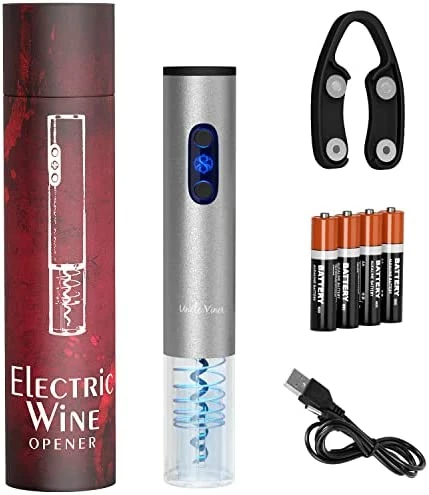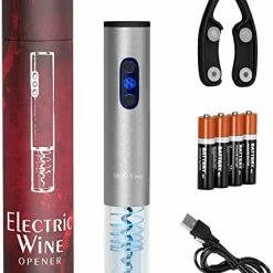 - Fancy Wine Opener gift kit includes Cordless Automatic Rechargeable Corkscrew, Foil Removal, Aerator Wine Pourer, Two Vacuum Wine Stoppers, 4 AA batteries (NiMh), Charger.