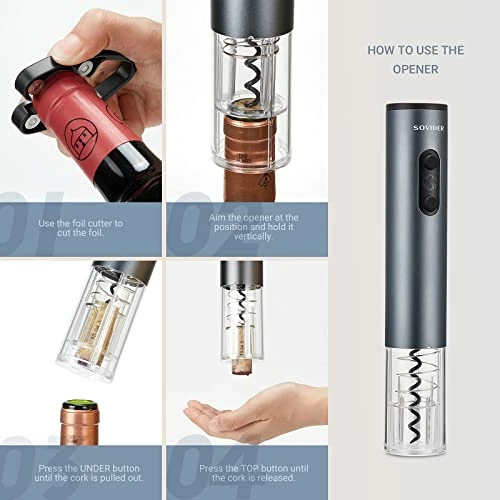 - γFull-Automatic and SafetyγSOVIDER Electric Wine Opener features an ergonomic .Just click “Down& Up” button and within 4~6 seconds the cork remove automatically with true hands free. keep clear insight into the operating status through the transparent part of the body. There are no more unexpected injuries whenever you are extracting the cork