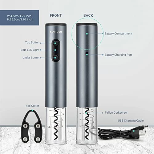 - γWhat You GetγOne Electric Wine Bottle Opener, 4* Rechargeable AAA Battery, A Foil Cutter and USB charge cable. Contains all you need , it will be a wonderful gift for wine lover or yourself