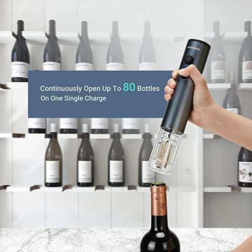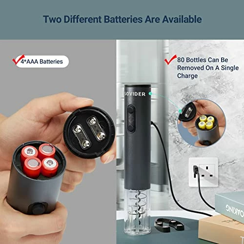 - γTWO USE MODE γSOVIDER Electric wine opener easily remove corks in 4-6 seconds and comes with the rechargeable batteries. One Charge Opens 80 Bottles.But if your wine opener without power to charge batteries when it’s dead . AAA batteries are also suitable for this wine opener sets too. Don’t worry and don’t be embarrassed, free yourself outdoor