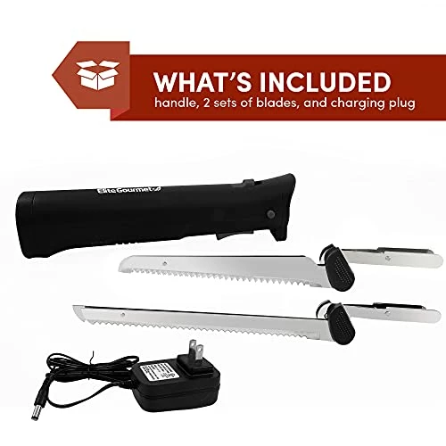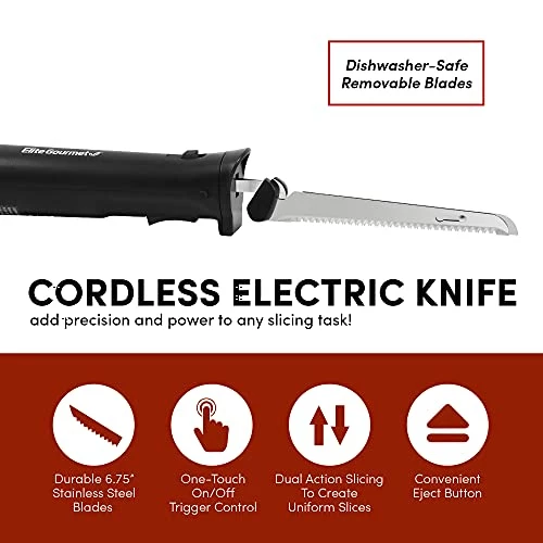 I have owned an electric knife 10+ years. This Elite Gourmet cordless, battery carving knife is a wonderful appliance. It is user friendly. The inserting of the blades is a learning process. The blades oscillate at high rpm. The knife cuts effortlessly. I love this Elite Gourmet knife because it is cordless. It is well made.