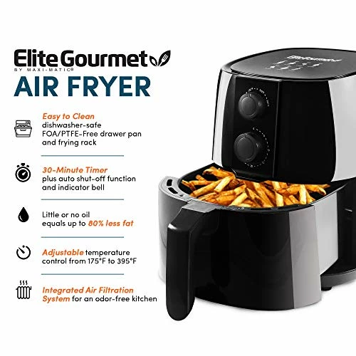 - ADJUSTABLE TIME AND TEMPERATURE dials give you the ultimate in cooking control and versatility allowing you to fry, bake, grill and roast all in one. A high-power convection fan envelops food in temperatures from 176 to 392F degrees and 30-minute timer automatically shuts off the Elite Gourmet Air Fryer at the end of the cooking cycle.