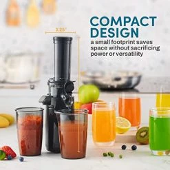 - ULTRA COMPACT SIZE yet durable with its heavy-duty auger providing superior juicing for healthy living and space saving. Includes a 16 oz juice cup and separate pulp container.