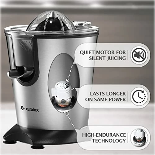 - POWERFUL JUICING TECHNOLOGY – Eurolux ELCJ-1900 Electric Citrus Juicer uses a new and improved motor gear that offers a quiet yet powerful juice extraction at only 120 Watts. It provides the same exact power as with 160W juicers but is made more energy-efficient and expected to last longer.