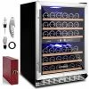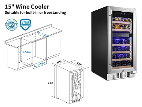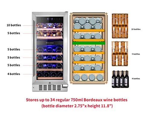 - 【Modern wine cooler】: Designed with a stylish look for display in kitchen/home bar/pantry/hotel. ★ 88 Liters with product dimensions 33.5″(H) x 15″(W) x 25″(depth with handle)/23″(depth without handle) ★ Stores up to 34 regular standard Bordeaux 750ml bottles with diameter 2.75″x height 11.8″. ★ Dual Zone Thermostat: upper zone:41-54℉(5-12℃),lower zone:54-72℉(12-22℃).