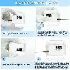 - 【How to Change the Password】: Step 1: Adjust the lock to the initial password: 000, press and hold the switch to open the lock; Step 2: Use a tool (you need to bring your own) to hold the regulator in the password adjustment interface (do not loosen it) at the same time change the new password(be sure to remember the password!!!); Step 3: After the password is set, scramble the password again to lock it.