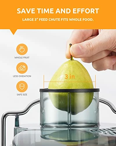 - [Save Prep Time] – The unique 3 inch extra wide feed chute of the centrifugal juicer allows you skip the pre-cutting, to juice whole fruits and vegetables. Easy installation can be installed in just several steps, which is friendly for young and old. All designs are for you and your family to drink healthy juice faster.