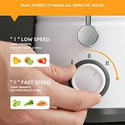 - [Dual Speeds System] – Juice extractor with dual speeds system gives you full control over the softest or hardest fruits and veggies. “β ” low speed, 13000-15000 RPM, for soft fruits like oranges, tomatoes and others; “β ‘” fast speed, 16000-18000 RPM, for hard fruits like apple, celery, carrot, kale and others.