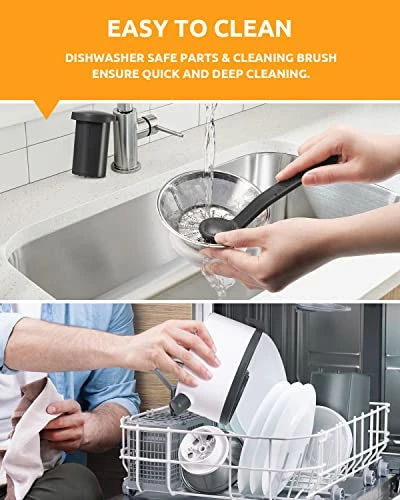 - [Easy to Clean] – Include a special brush to make cleaning easier and faster. All removable parts of the celery juicer are dishwasher safe and BPA-Free. While you are still enjoying the juice, parts has been cleaned well. Spout with anti-drip design can prevent the juicer machines from dripping and keep the work top clean.