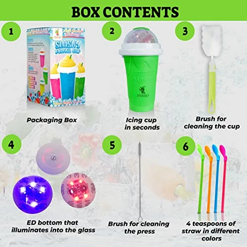 - Complete Set: Together with our slushy cup maker, you will also get a straw teaspoon, a cup brush and straw brush for easy cleaning, as well as a cup stopper. Additionally, you also get the amazing LED bottom for a unique experience. The cup is colorful and reusable, allowing you to create countless treats. It also makes for a unique gift for your loved ones.