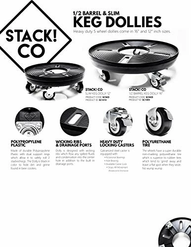 - The black StackCo Keg Dollies are much better than the less expensive keg dollies you’ll see on Amazon. Ours are made of reinforced durable plastic that will hold 2 kegs without a problem.