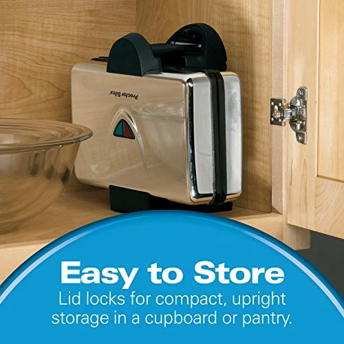 - EASY TO STORE: The lid locks for compact, upright storage of waffle maker in a cupboard or pantry