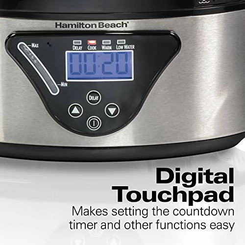 - GUESS-FREE STEAMING: Just fill it up and set the timer. When the food is ready, it will automatically switch to Warm. It also includes Delay Start and Auto Shutoff DIGITAL TOUCHPAD: Easily set the countdown timer and other functions easily.
