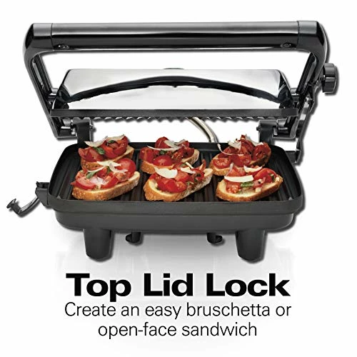 - TOP LID LOCK: Lock panini press lid to create an easy bruschetta or open-face sandwiches.