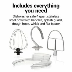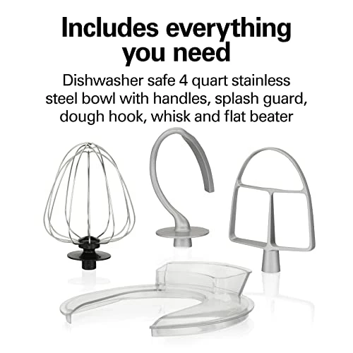 - Mixing versatility: includes splash guard, dough hook, whisk and flat beater.