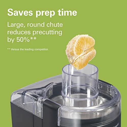 - SAVES PREP TIME — LARGE CHUTE REDUCES PRECUTTING BY 50%**. The large, round 2.4″ chute on this fruit and vegetable juicer saves you prep time and effort because it fits more produce and larger pieces with less precutting.