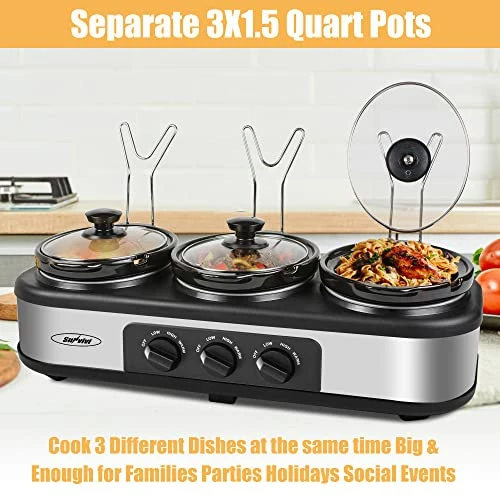 - 【Three 1.5 Quart Ceramic Pots】There are 3 separate ceramic pots, you can cook 3 separate dishes at the same time. And the pots are removable, it is easy for cleaning. With this triple slow cooker, it will help you save much time on holidays and parties. Each slow cooker is a 1.5 quart capacity that equals a total of 4.5 Quarts