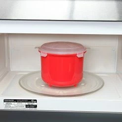 - MAKES COOKING RICE EASY & HASSLE-FREE: Simply add rice and water according to directions. Place inner and out lids on top, and microwave about 15 mins. The inner lid pressure chamber let steam escape slowly to ensure even cooking and fluffy results. Designed specifically for cooking and reheating in the microwave.